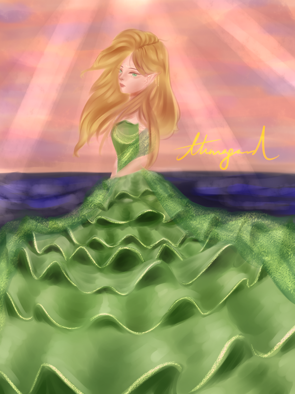 A drawing of a girl in a green dress